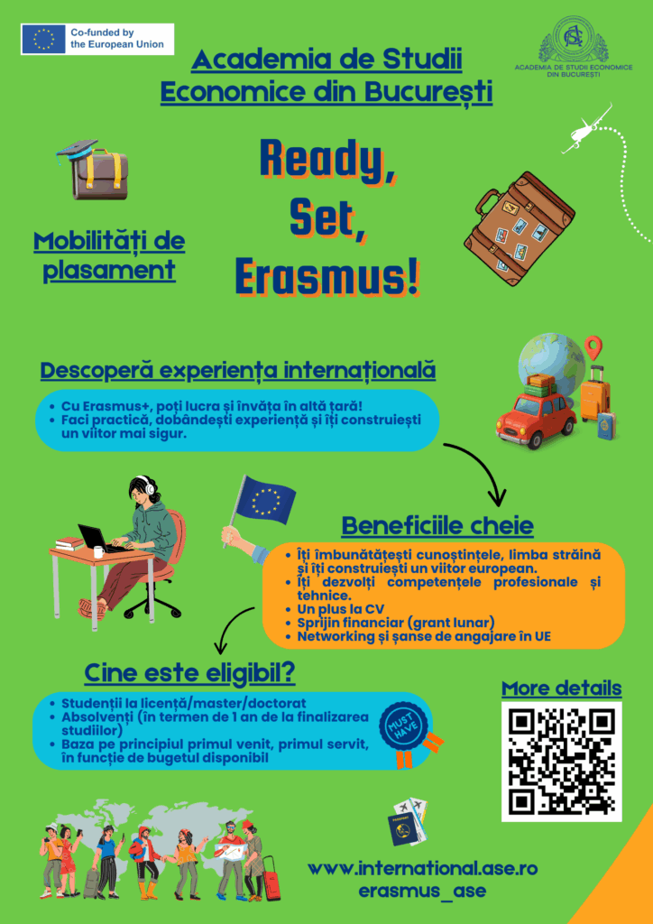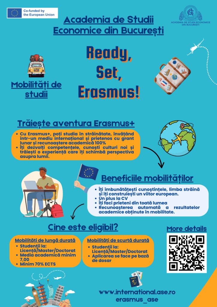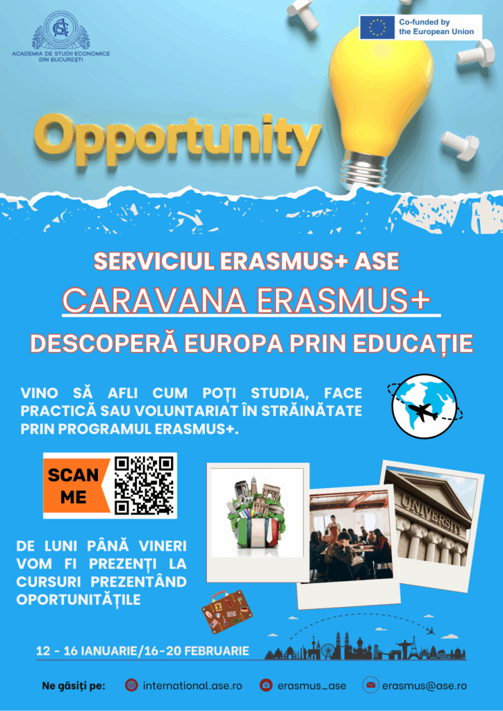 Vă aducem la cunoștință că în săptămâna 12-16 ianuarie 2026 și 16-20 februarie 2026 se va organiza Caravana Erasmus+ de promovare a mobilităților de studiu de lungă durată (adică de un semestru sau tot anul universitar 2026-2027).
