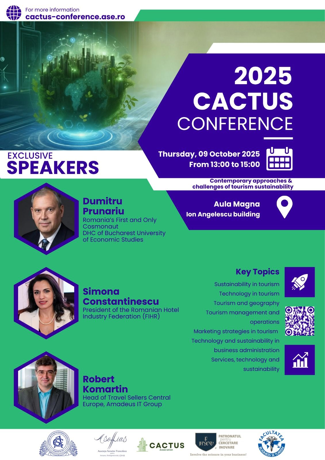 Pe 9 octombrie 2025, între 13:00 și 15:00, vă invităm să luați parte la Conferința CACTUS 2025, eveniment dedicat celor mai noi perspective și provocări din domeniul sustenabilității în turism.